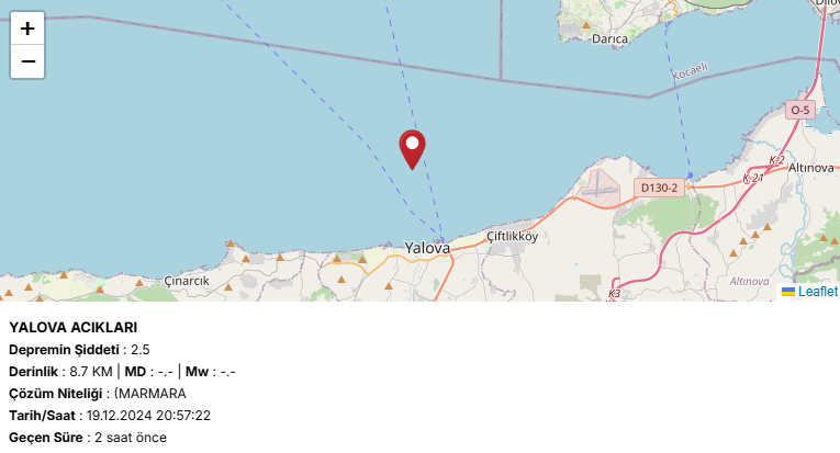 19.12.2024 20.57 de Yalova Açıklarında 2.5 Şiddetinde Deprem Meydana Geldi. Deprem Şehir Merkezi ve ilçelerinde hafif olarak hissedildi.
